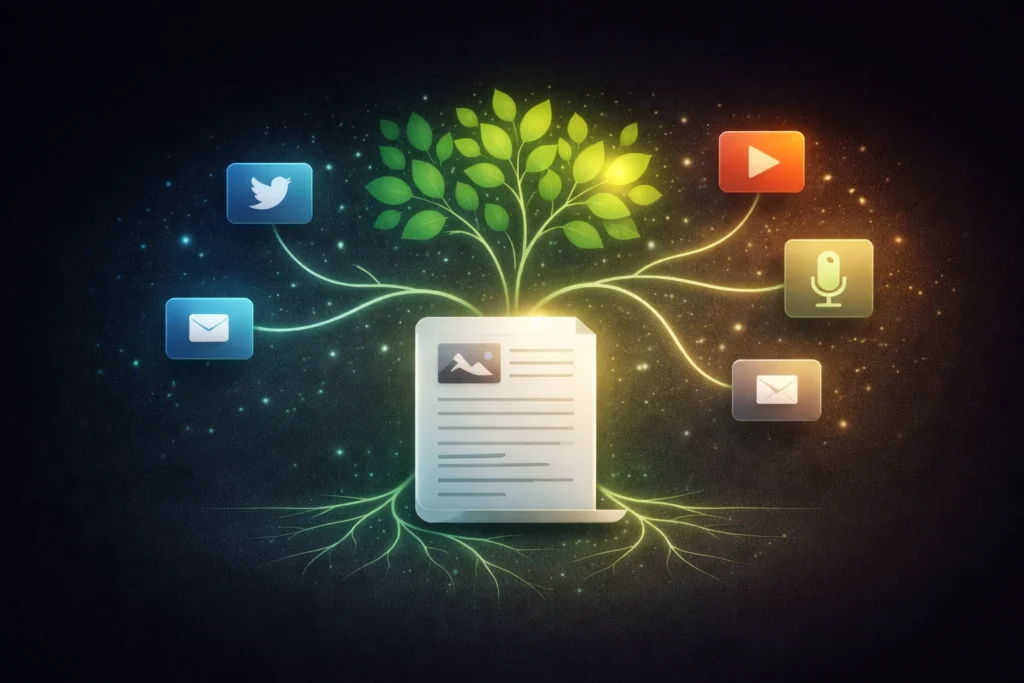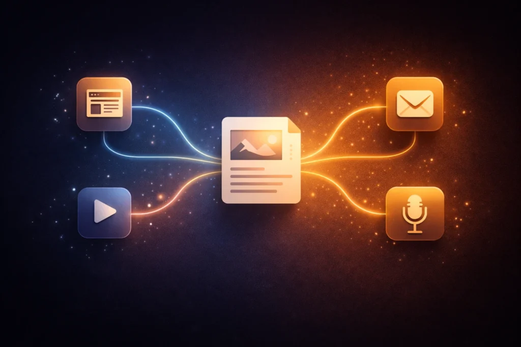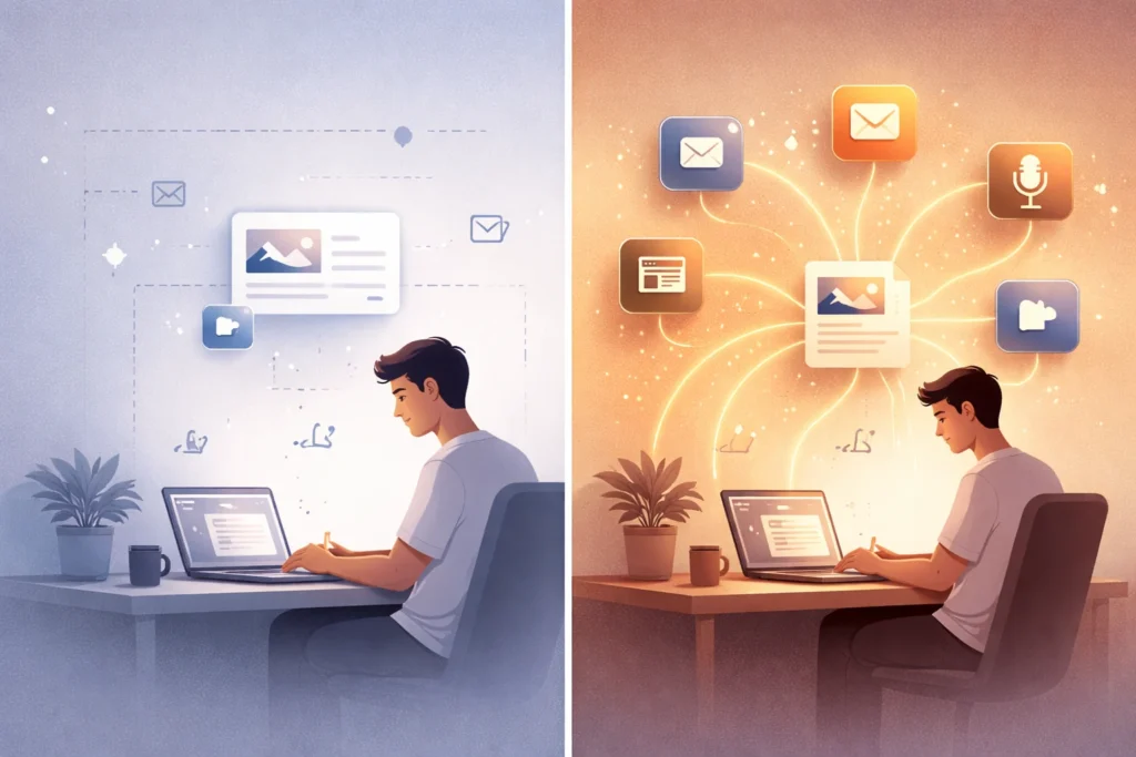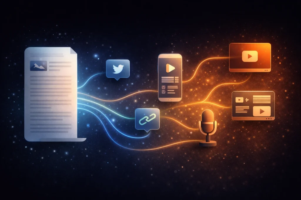 مثال آخر: لنقل أنك سجلت بودكاست عن “اتجاهات التجارة الإلكترونية في 2024”. النشر التقليدي يعني رفعه على منصة البودكاست وإرسال إشعار للمشتركين. التوزيع الذكي يعني استخراج أهم النقاط وتحويلها إلى: